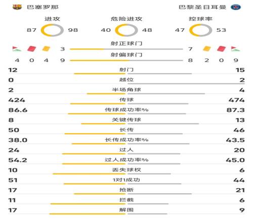 在传球方面,大巴黎以474-424同样高出,传球成功率方面则是以87.3%-86.6%稍占优势;在关键传球方面,大巴黎则以13-8同样优势明显。在过人方面,巴萨以24-20领先,在过人成功率以54.2%-45%占优