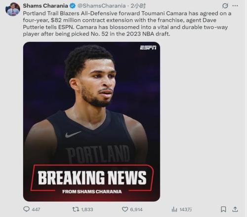 夏普是2022年首轮7号秀,新秀合同明年夏天到期,还剩1年840万美元。卡马拉是2023年52号秀,新秀合同将在2027年夏天到期,还剩2年462万美元。开拓者此次续约卡马拉,相当于放弃2026-27赛季的球队选项,新合同将在2030年到期。