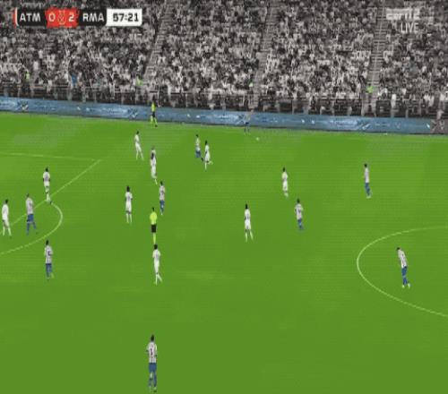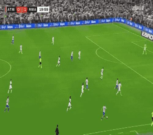 随着比赛的进行,马竞逐渐加强进攻,库尔图瓦越来越忙,第38分钟,马竞上演三连击,继续考验皇马的防线。